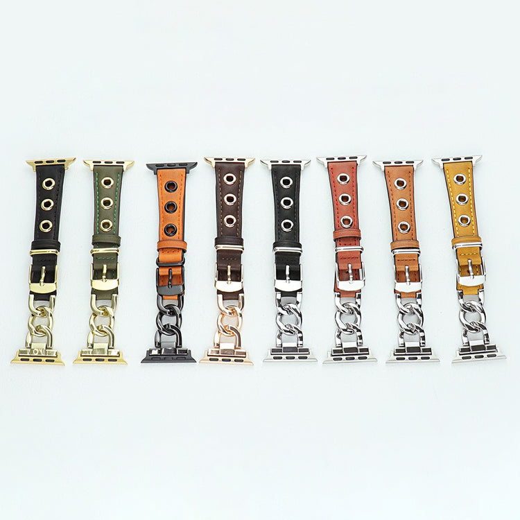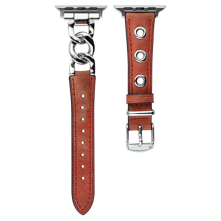 Tämä aito nahkainen ranneke sopii useimpiin Apple Watch -malleihin. Ketjumainen kuviointi ja solki tekevät siitä tyylikkään ja säädettävän. Täydellinen valinta arkikäyttöön tai asuun sopivaksi yksityiskohdaksi.